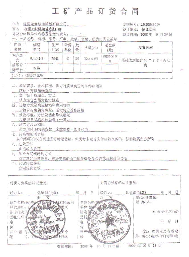 2008年10月28日中國人民解放軍總參三部物資處3名解放軍干部來我公司實地考察。考察比較后對我公司的規(guī)模和產(chǎn)品給予了極大的肯定,并就一直聯(lián)系的要購買的25臺鋁合金升降機(jī)簽訂了訂貨合同。現(xiàn)我公司已按照約定如期交貨,總參三部驗收后非常滿意,并已全部付款到位。