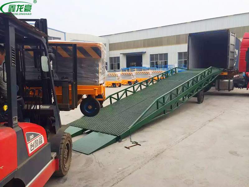 移動式液壓登車橋主要用于無裝卸設備的貨臺及流動裝卸場所,可與叉車配合使用,是貨物裝卸專用輔助設備。產品可達到的高度為1.1米至1.8米,可以根據貨車高度進行調節,是裝卸貨物不可缺少的升降液壓設備之一。移動式液壓登車橋的主要作用是在地平面與車廂之間搭起一座橋,有了它,叉車能直接從地面攜帶貨物駛入汽車車廂內部,進行批量裝卸作業。使用時前板架在貨車車廂上,起到承載重量的作用,減少了貨物重量對液壓設備的壓力,保證了液壓登車橋的使用壽命,從而達到長期使用的目的。借助液壓登車橋,叉車能直接駛入汽車集裝箱內部進行批量裝卸作業。